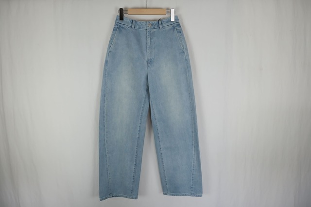 <デザイン> - ワイドカーブシルエットのツイルパンツ - スラックスのディティールを取り入れたデザイン - サイドの切り替えを前に振った立体裁断のパターン - バックにアクセントになるレザーロゴパッチ <素材> - 適度な厚みの12ozデニム - ストーンブリーチ加工による程よい擦れ感 - 職人による手作業のブラスト加工 サイズ ウエスト 股上 股下 すそ周り もも周り ヒップ 1 67 31 70.5 46.5 62 99.5 2 72 32 72.5 48.5 66 105 素材 コットン100% 革ラベル:牛革 原産国 中国 カラー DENIM 女性モデル153㎝ LT.BLUE 1着用