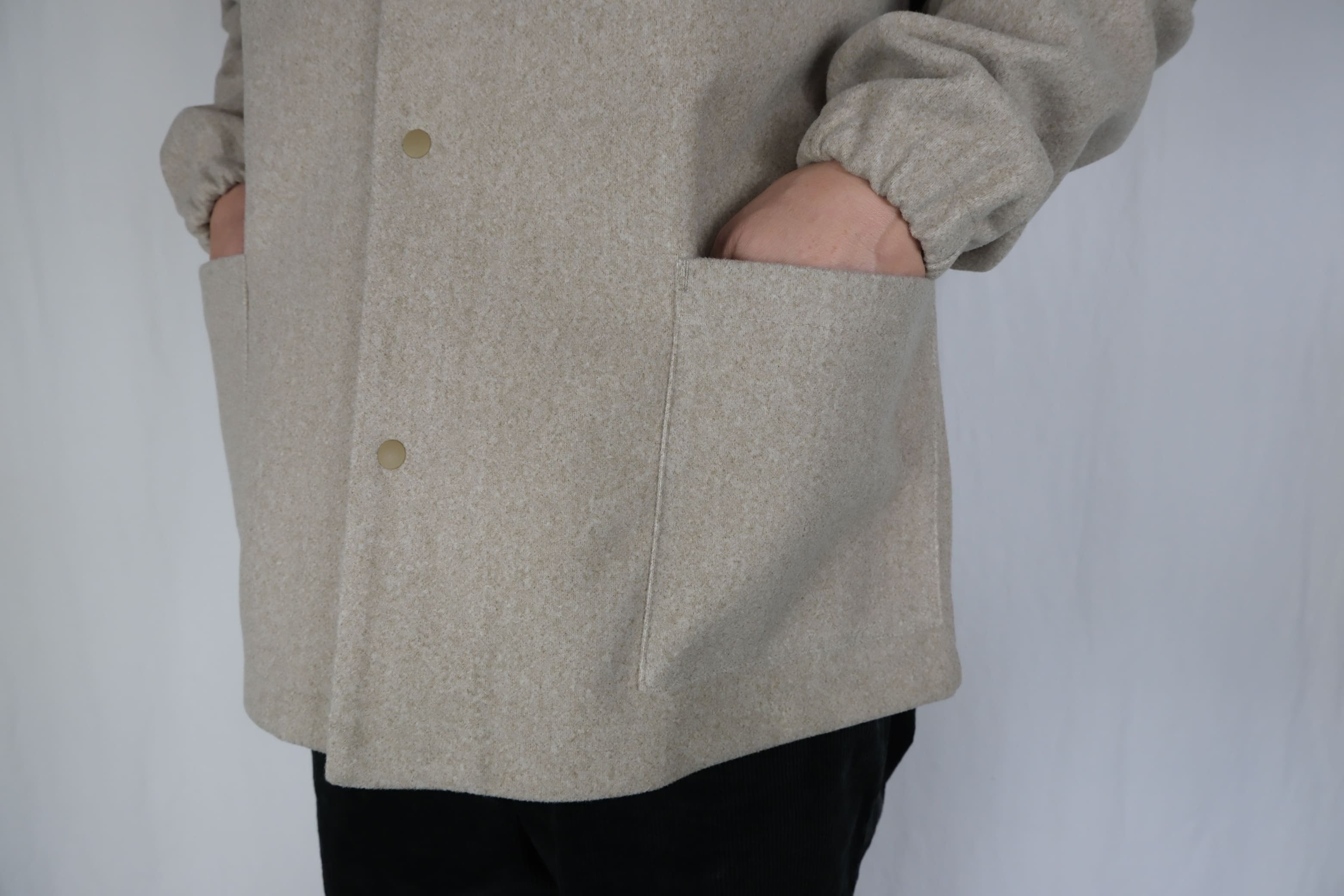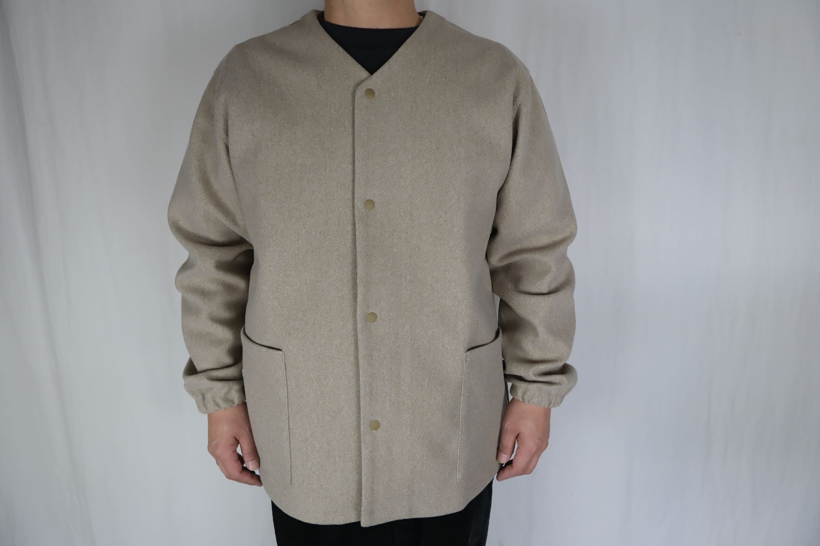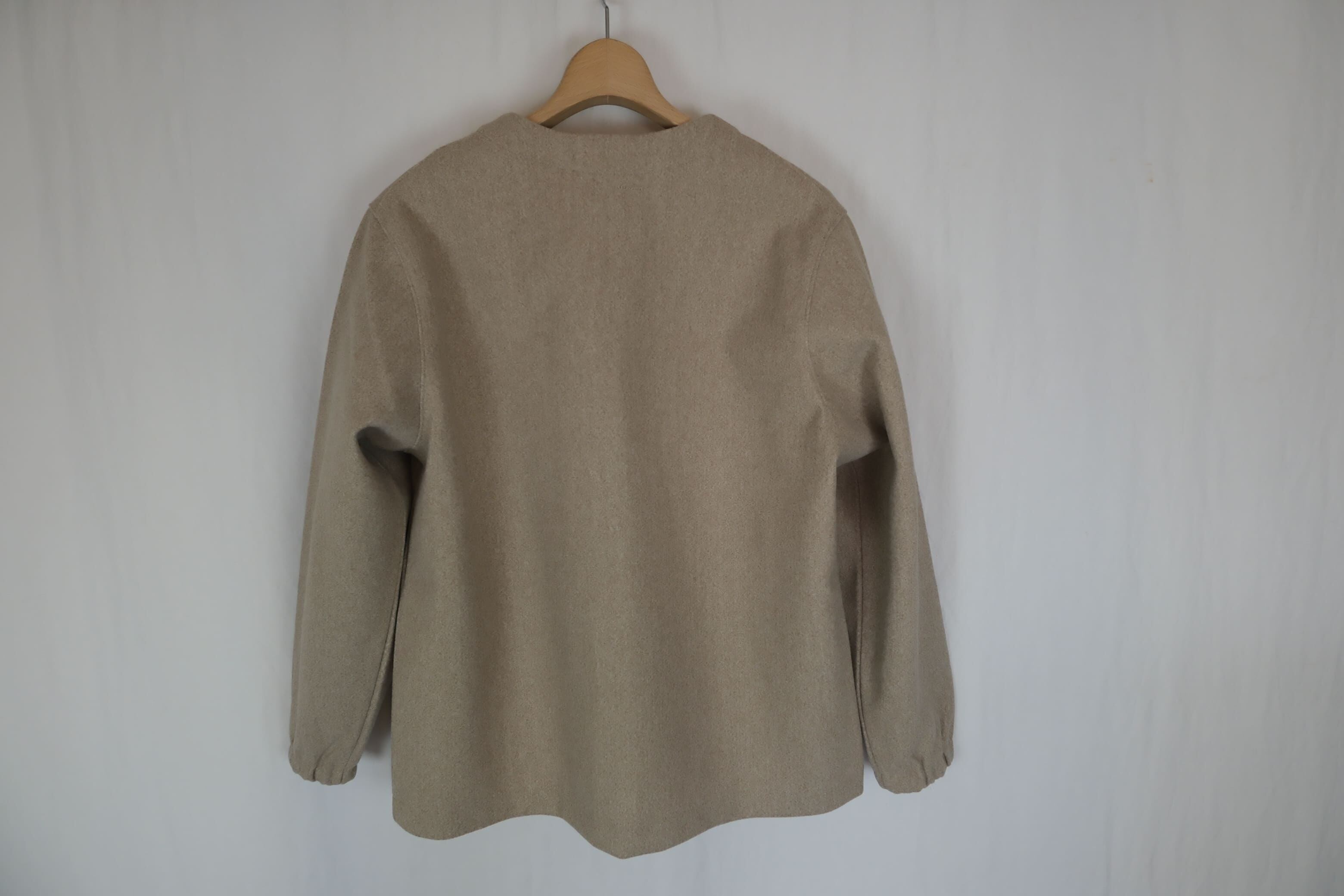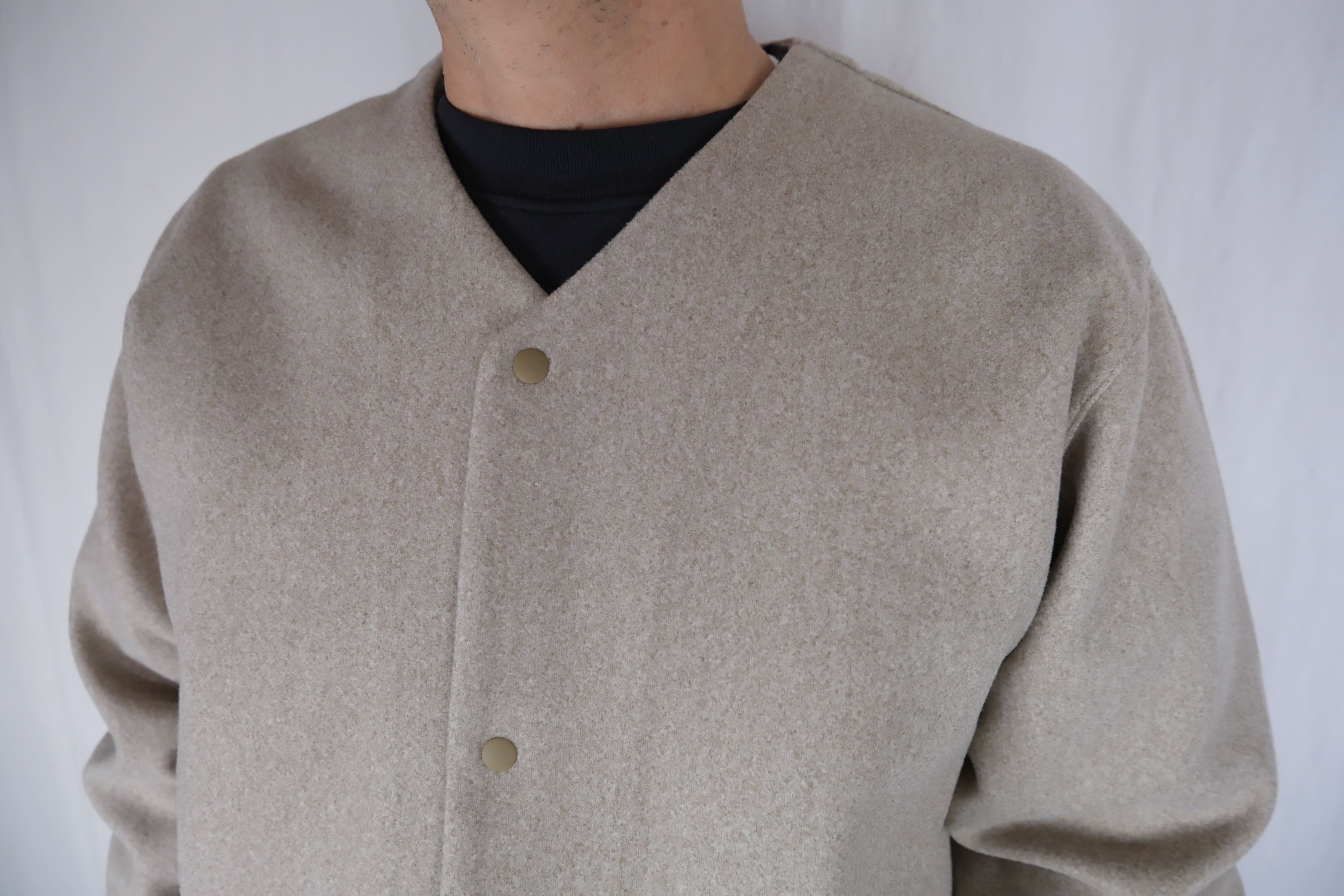 コートなどに使われるメルトンのようなウォーム感のあるニット素材。 素材感を活かした柔らかいフォルムと、シンプルなデザイン。 軽さと暖かさ、ナチュラルストレッチもきいて、部屋着としても軽アウターとしても使えて人気のモデル。