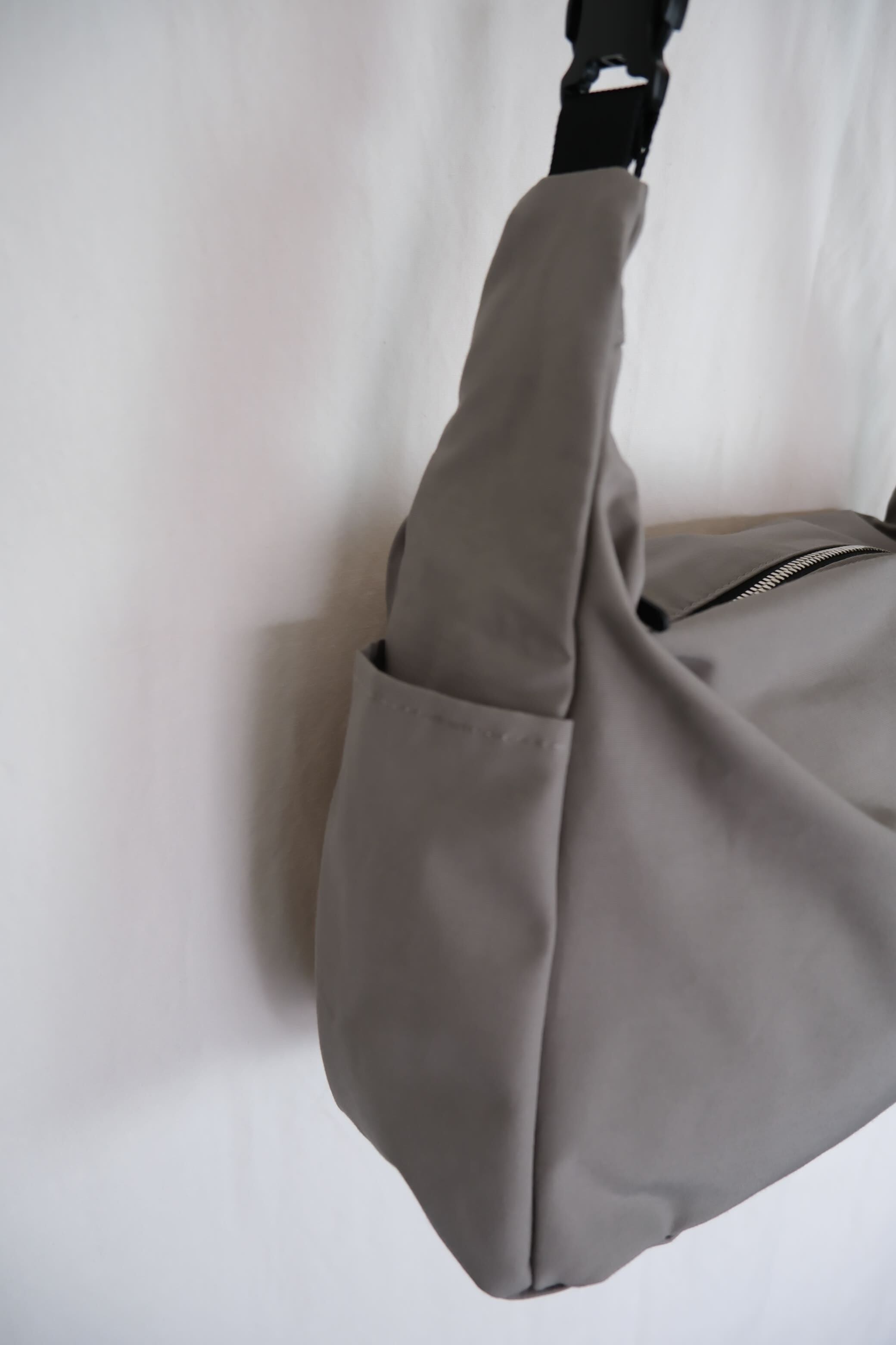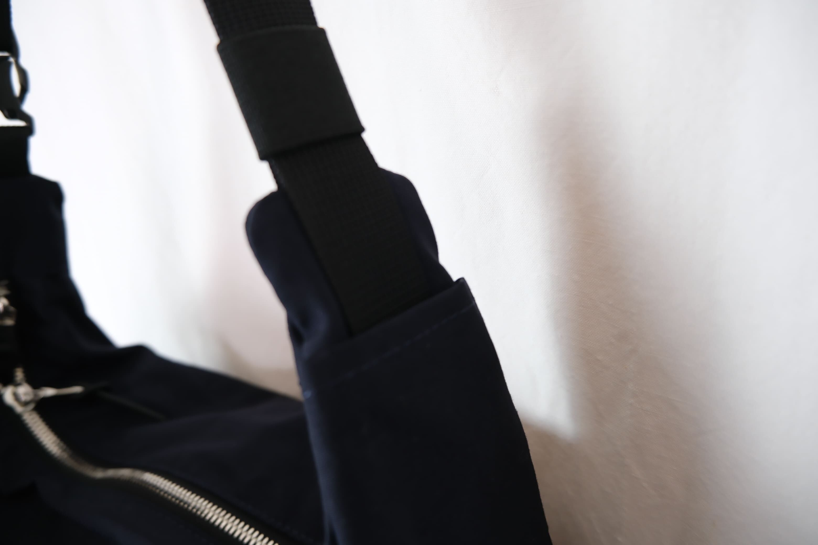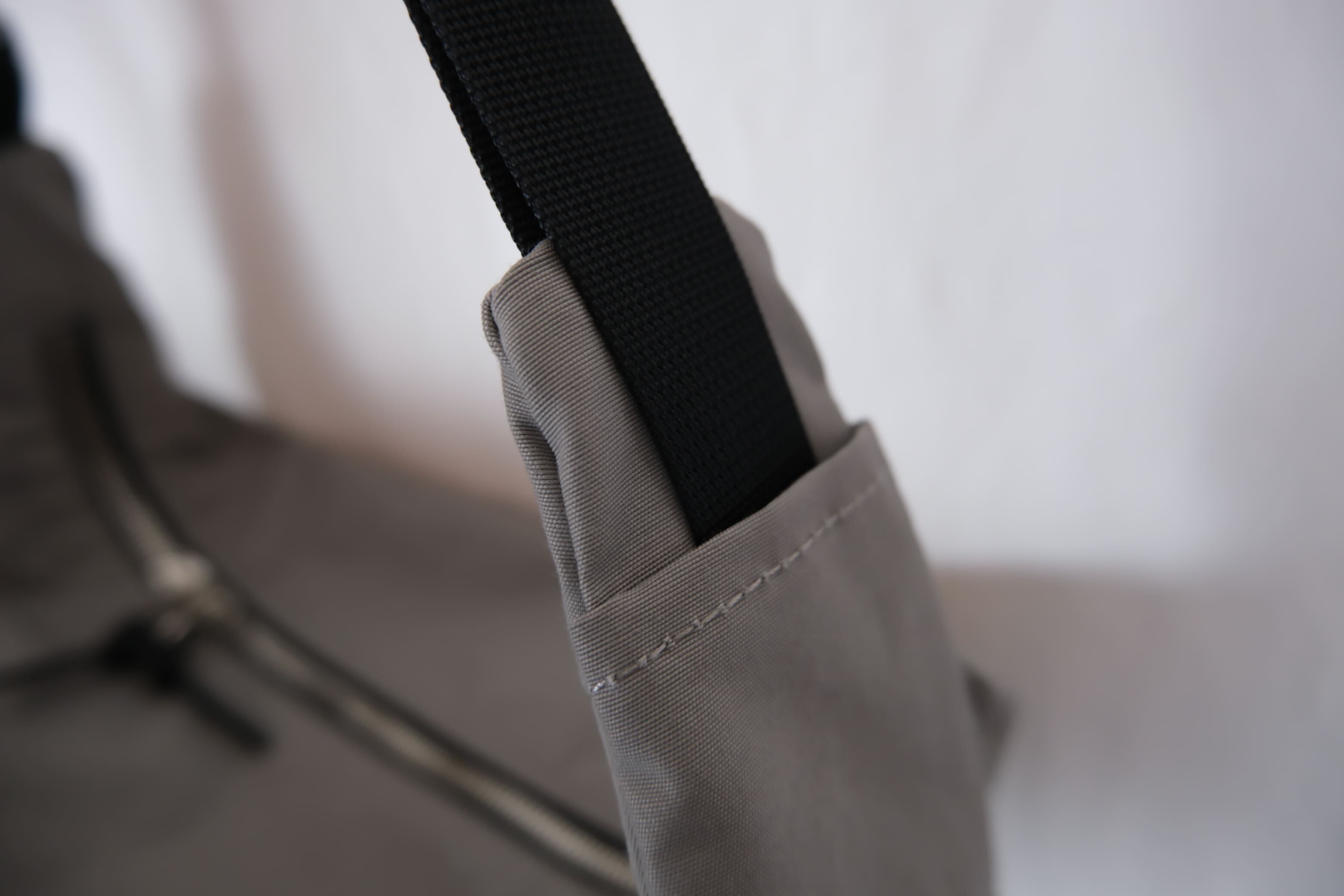 片側に携帯電話が入るポケットを付けています。反対側にはショルダーテープが収納できるポケットを付けています。